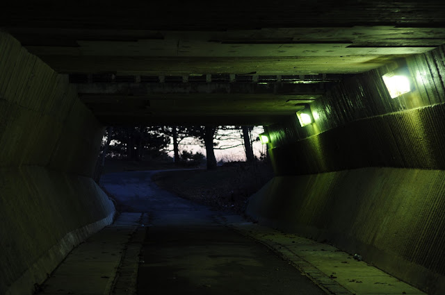 This shot was so much prettier in real life. The tunnel was green, the footpath on the other side was bright blue from the sky, and the sky on the horizon was pink from the sunset.