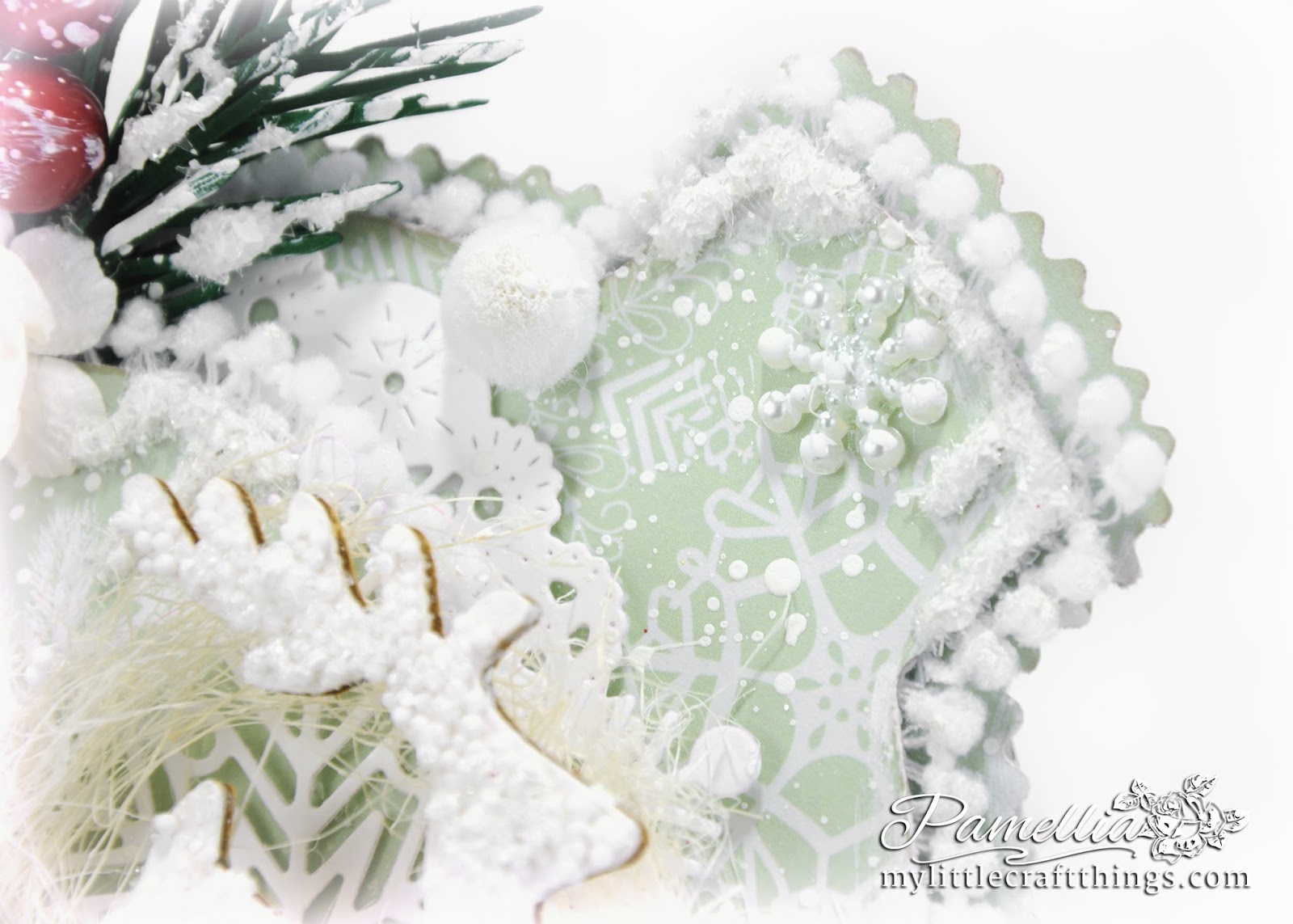 12. Another fabulous ornament card, awesome work!! Love very much how you recycled the styrofoam balls to put them on the reindeer, such a clever idea and you have achieved an amazing texture!! Fabulous snow feel and the little pom pom lace all around makes me blow up!!
